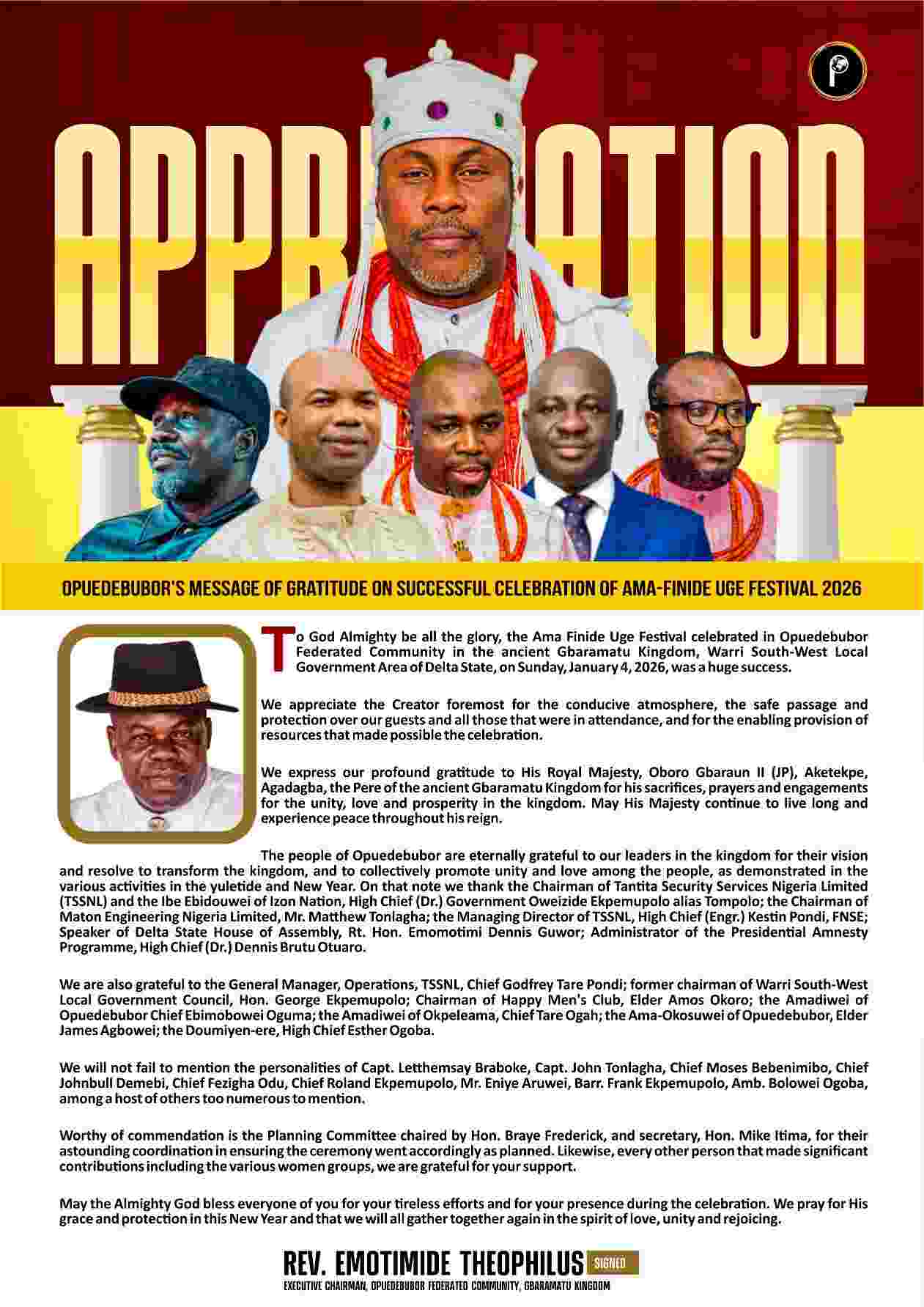 I, Captain William Ubebe, the Executive Chairman of Inikorogha Federated Community in the ancient Gbaramatu Kingdom, Warri South-West Local Government Area of Delta State, on behalf of the good people of the community thank the Almighty God for the successful outing recorded at the recently concluded Ama-Ebide Festival in the community.