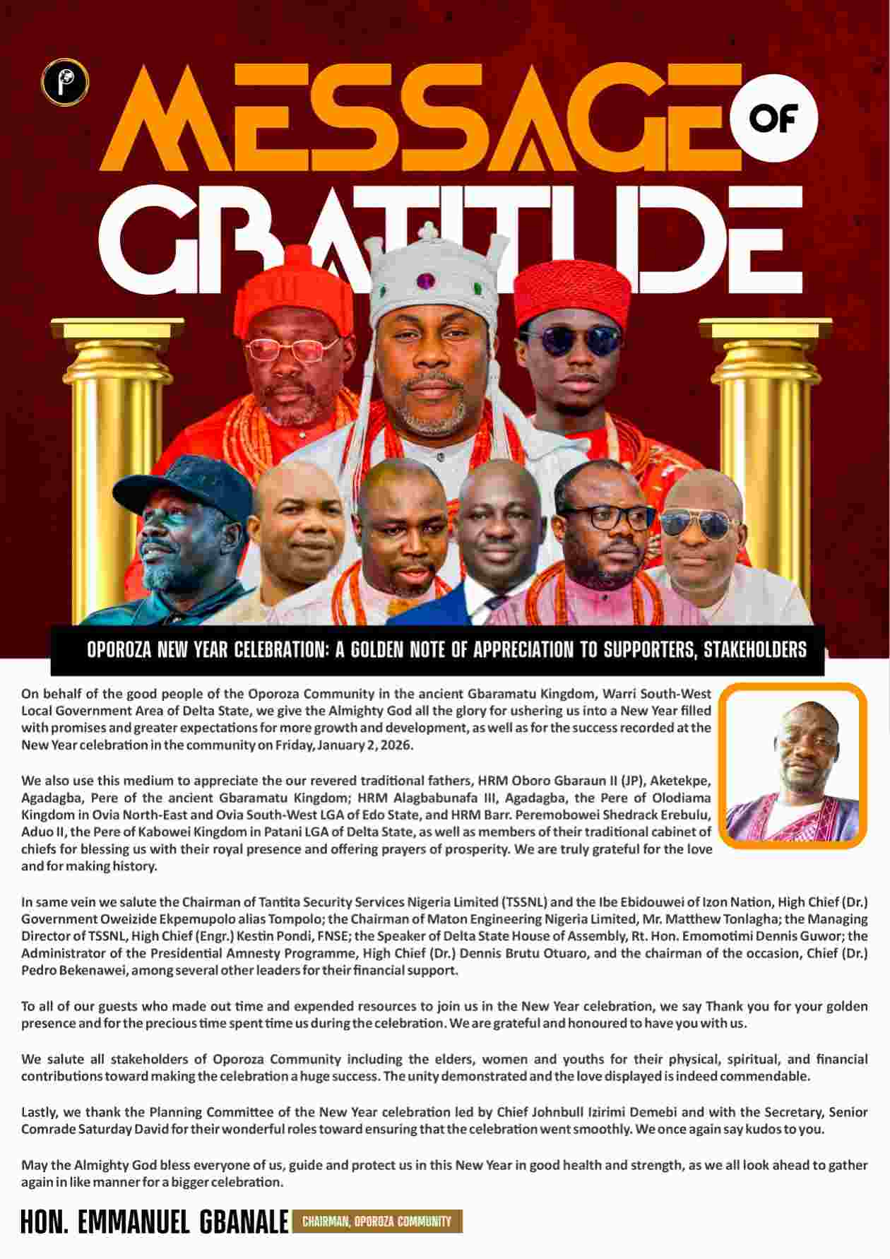 The leadership of Igoba Federated Community in the ancient Gbaramatu Kingdom, Warri South-West Local Government Area of Delta State, use this medium to tender its profound gratitude to sponsors and other stakeholders of the community on the success recorded at the annual Amabo-Ugeh Festival, which held in the community on Thursday, January 1, 2026.