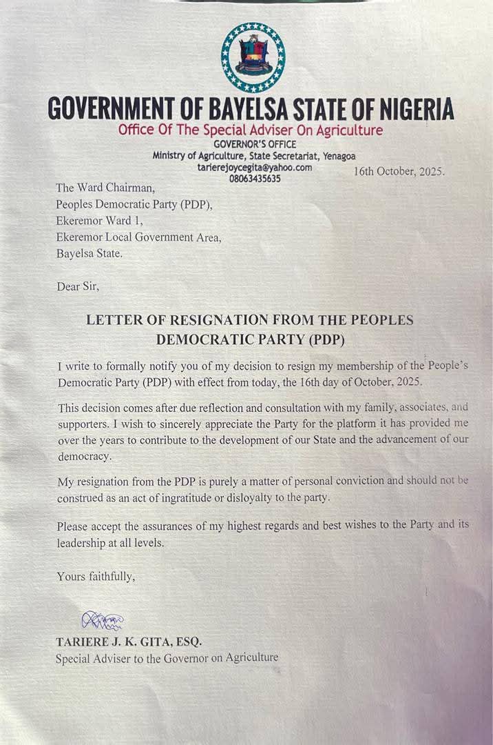 The Special Adviser to the Governor on Agriculture in Bayelsa State, Tari-ere Gita Esq., has officially resigned her membership from the People's Democratic Party (PDP) as contained in a Resignation Letter dated 16th October 2025.
