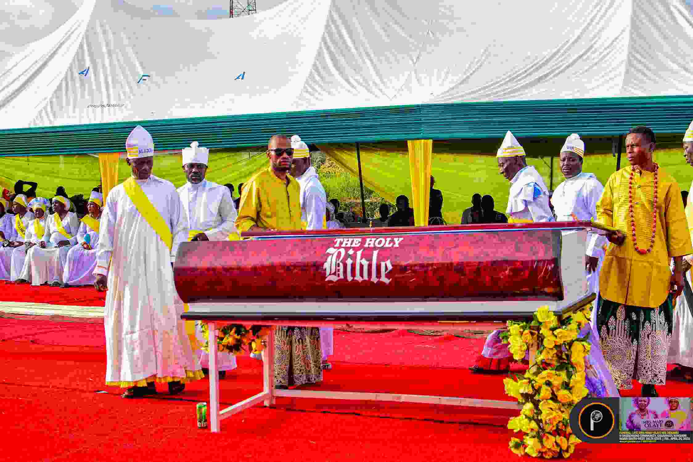 The atmosphere at the Bibopere Zion in Okerenkoko Federated Community, Gbaramatu Kingdom, Warri South-West Local Government Area of Delta State, was a mixture of sadness and eternal expectations as the late Mother Mary Olaye nee Dekawei was given a final Christian funeral rite in honour of her memory before being laid to rest in a Bible-shaped casket on Friday, April 24, 2026.
