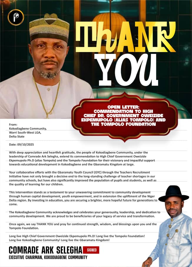 "With deep appreciation and heartfelt gratitude, the people of Kokodiagbene Community, under the leadership of Comrade Ark Selegha, extend its commendation to High Chief Government Oweizide Ekpemupolo Ph.D (alias Tompolo) and the Tompolo Foundation for their visionary and impactful support towards educational development in Kokodiagbene and the Gbaramatu Kingdom at large.
