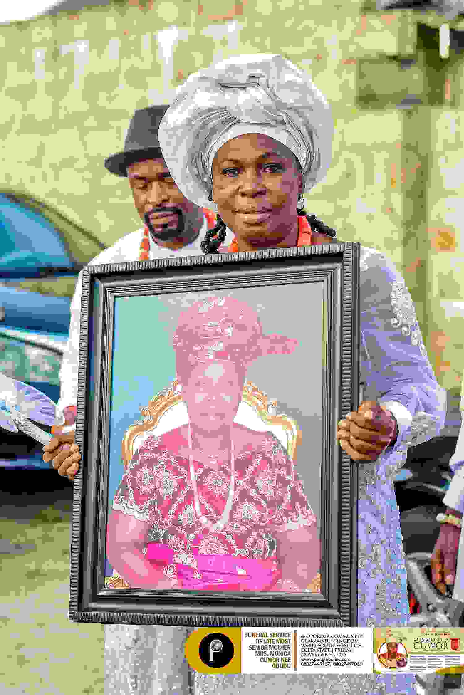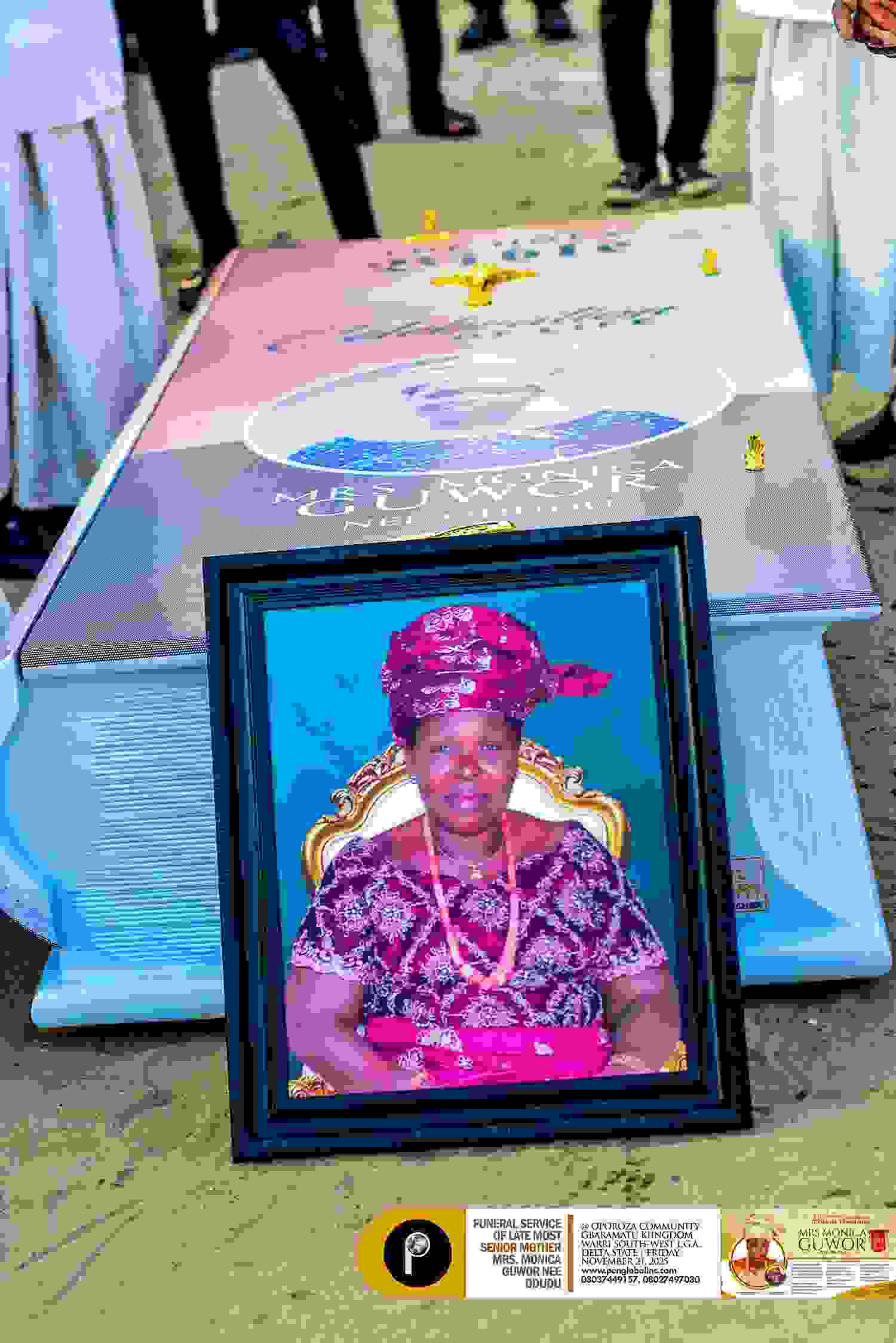 The Olotu of Ogulagha Kingdom, High Chief Council Guwor, has bid final farewell to his late wife, Most Senior Mother Monica Guwor nee Odudu, just as families, friends and sympathisers conveyed her corpse from the Safe Haven Mortuary in Warri, Delta State, to her hometown, Oporoza community in Gbaramatu Kingdom, for her final funeral rite, on Friday, November 21, 2025.