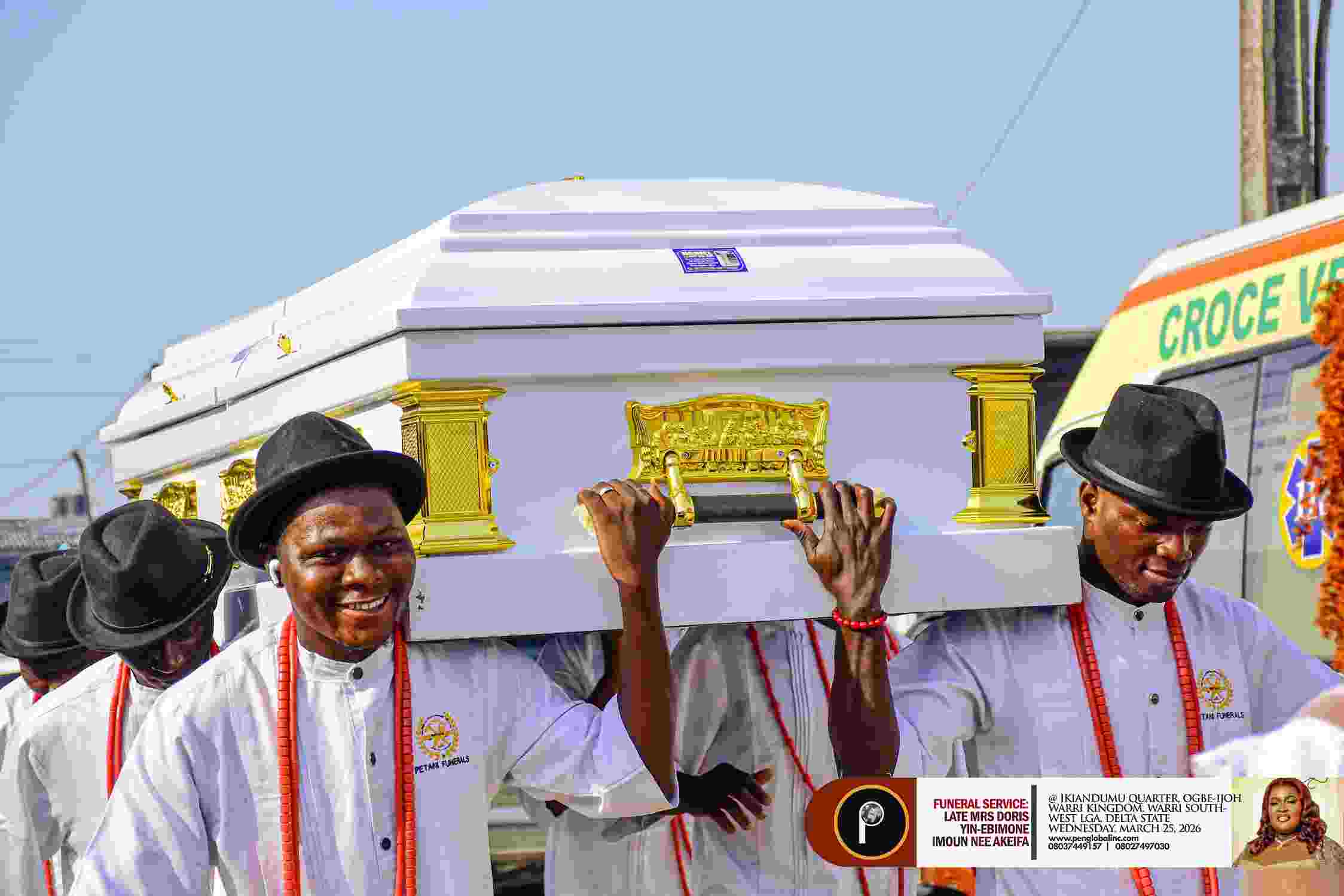 The final journey of late Mrs. Doris Yin-Ebimone Imoun, wife of the Sukorewei of ancient Gbaramatu Kingdom and noble son of Benikrukru Community, Chief Paris Imoun, began in the morning from the Safe Haven Mortuary, Okumagba Layout, in a motorcade to her quarter, Ikiandumu, Ogbe-Ijoh Warri Kingdom, where a Christian funeral service was conducted by the Chapel of Grace Ministries Int'l church, officiated by Pastor Ejovi Loyalty.