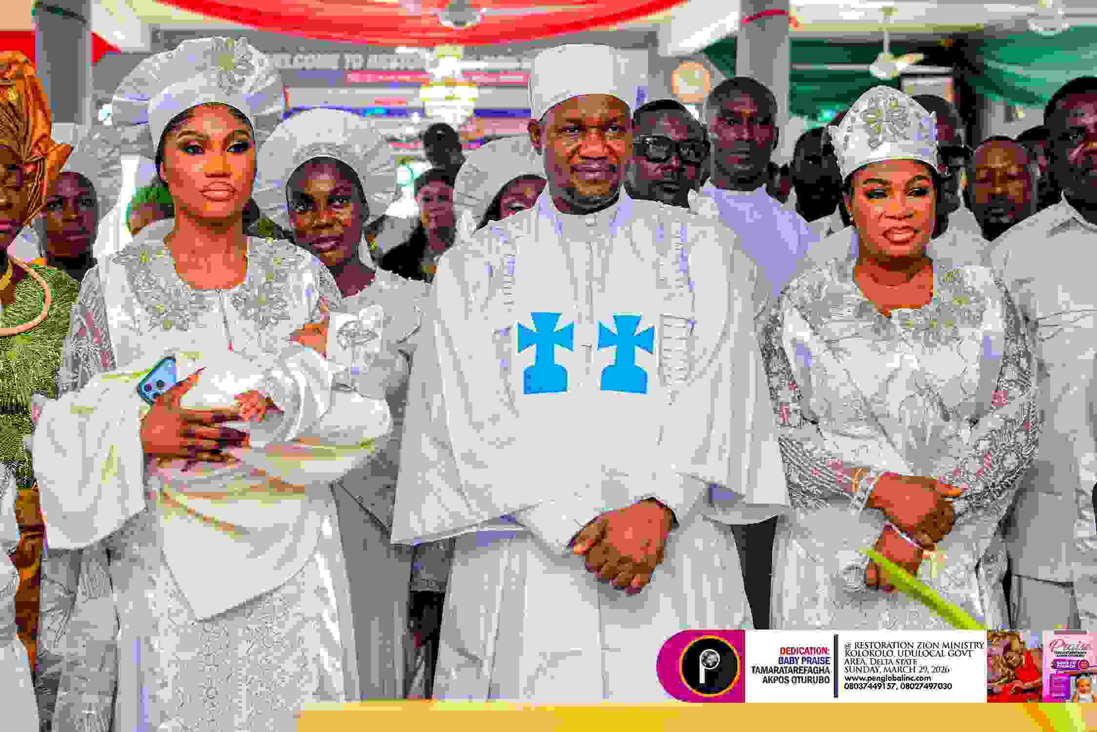 A guest and spiritual leader, the Minister-in-Charge of Bibopere Zion Okerenkoko, Apst. Peter Ebieride German, JP, did the honour of dedicating Baby Praise Tamaratarefagha Akpos during the dedication ceremony, while prayers of God's protection and blessings were offered on the infant and on his parents by the General Overseer of the ministry, Boan. Columbus Oluba, as well as on the congregation.
