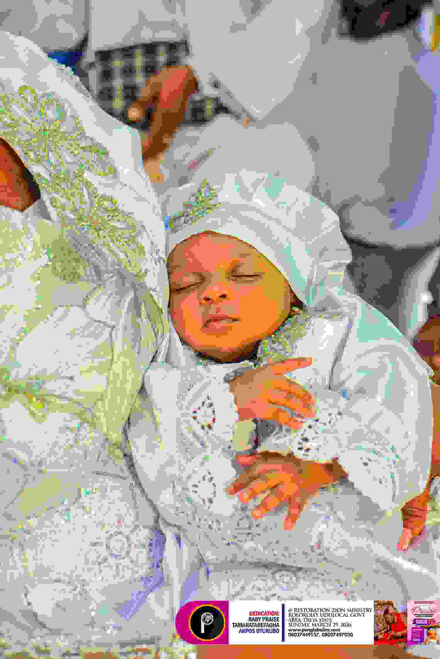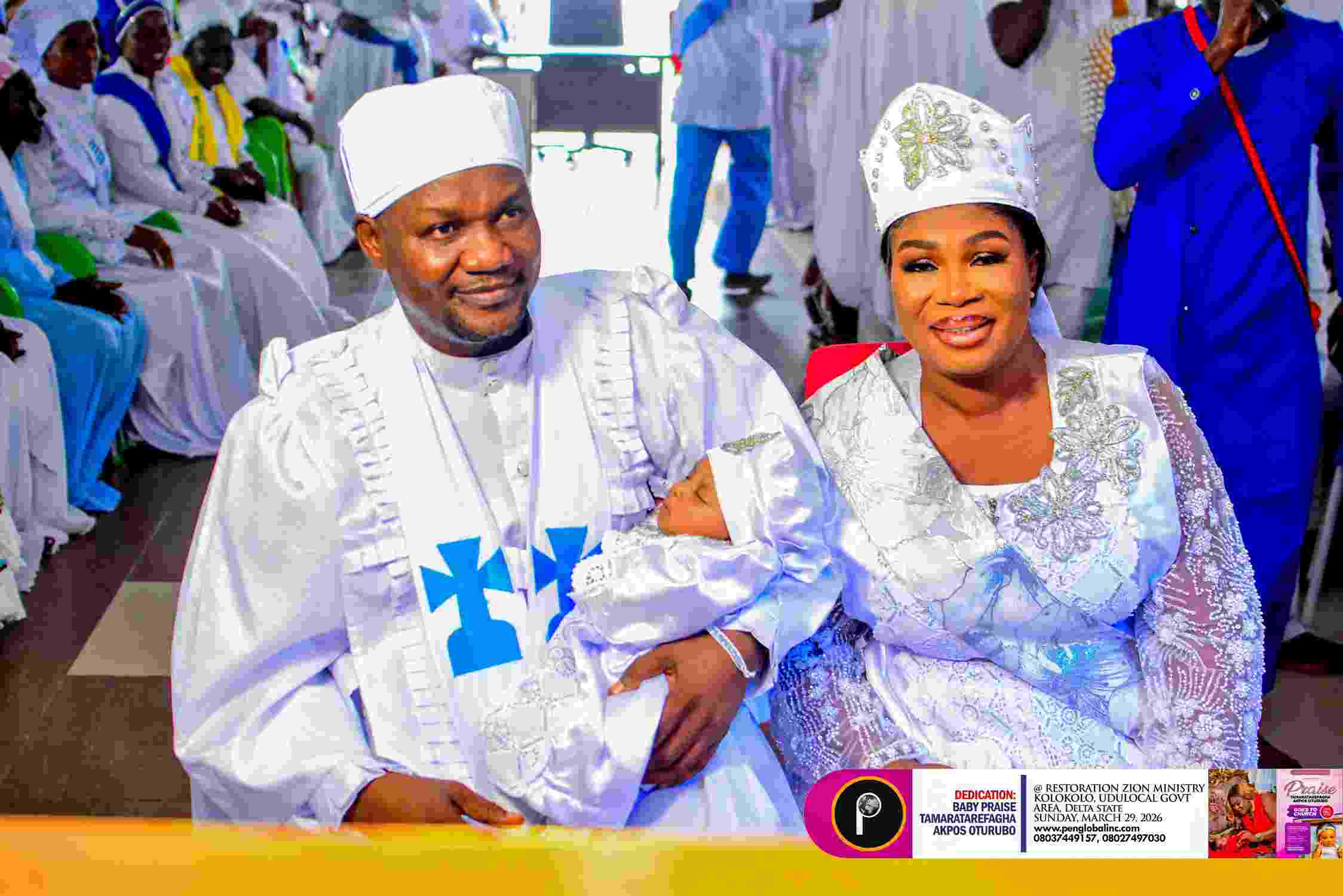 The couple made the confession at a Thanksgiving/Child Dedication ceremony of their infant child dubbed “Miracle Baby”, baby Praise Tamaratarefagha Akpos, which held in the Restoration Zion Kolokolo Cherubim and Seraphim Church in Udu Local Government Area of Delta State, on Sunday, March 29, 2026.