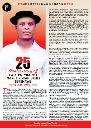 Today (July 28, 2024) makes it the 25th Anniversary that marked the departure of our loving father, grandfather, great grandfather, PA. VINCENT MARETINGHAN UKULI BEKENAWEI. In our tribute, we remember his exploits as presented here below, exploits that challenges us to live by his principles of unconditional service to God and to humanity as we all work hard to make a better version of ourselves.