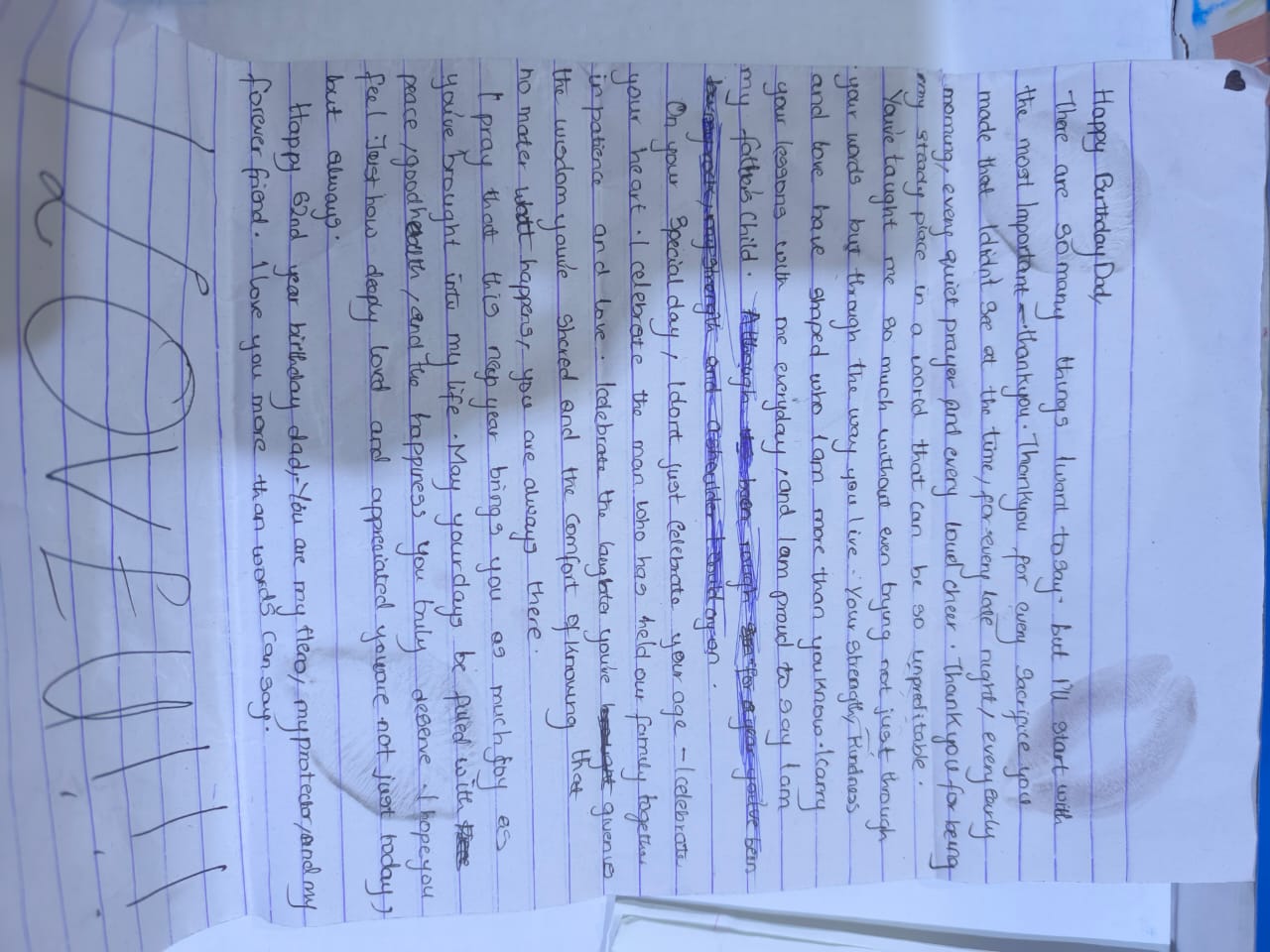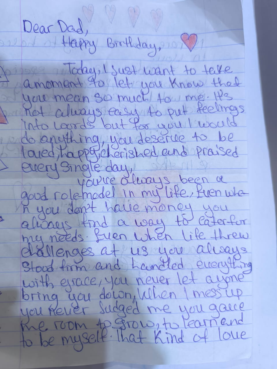 "Today, i just want to take a moment to let you know that you mean so much to me. It's not always easy to put feelings into words: for you I will do anything. You deserve to be loved, happy, cherished and praised every single day. You've always been a good role model in my life. Even when you don't have money, you always find a way to cater for my needs. Even when life throws challenges at us, you always stood and handled everything with grace. You never let anyone bring you down. When I messed up, you never judged me; you gave me room to grow, to learn and to be myself. That kind of love is rare. I am so happy to have it in you. Today is your special day; you will excel, prosper, live long and you will be great. You have been such a kind, compassionate human being. Thank you for being my rock, my world and the best dad in the world. I love you." — MISS CONSTANCE GBENEKAMA.