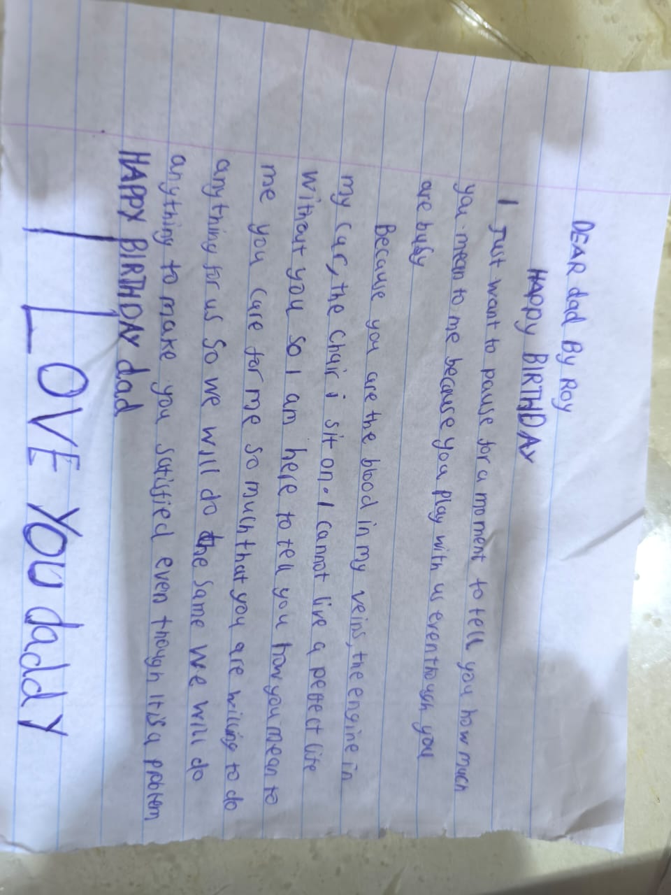 "Dear Dad, Happy Birthday. I just want to pause for a moment to tell you how much you mean to me because you play with us even though you are busy, because you are the blood in my vein, the engine in my car, the chair I sit on. I cannot live a perfect life without you. So, I am here to tell you how much you mean to me. You care for me so much that you are willing to do anything for us. So, we will do the same; we will do anything to make you satisfied even though it is a problem. Happy Birthday Dad. i love you Daddy." — MASTER FIYEWEI BENNY-ROY GBENEKAMA