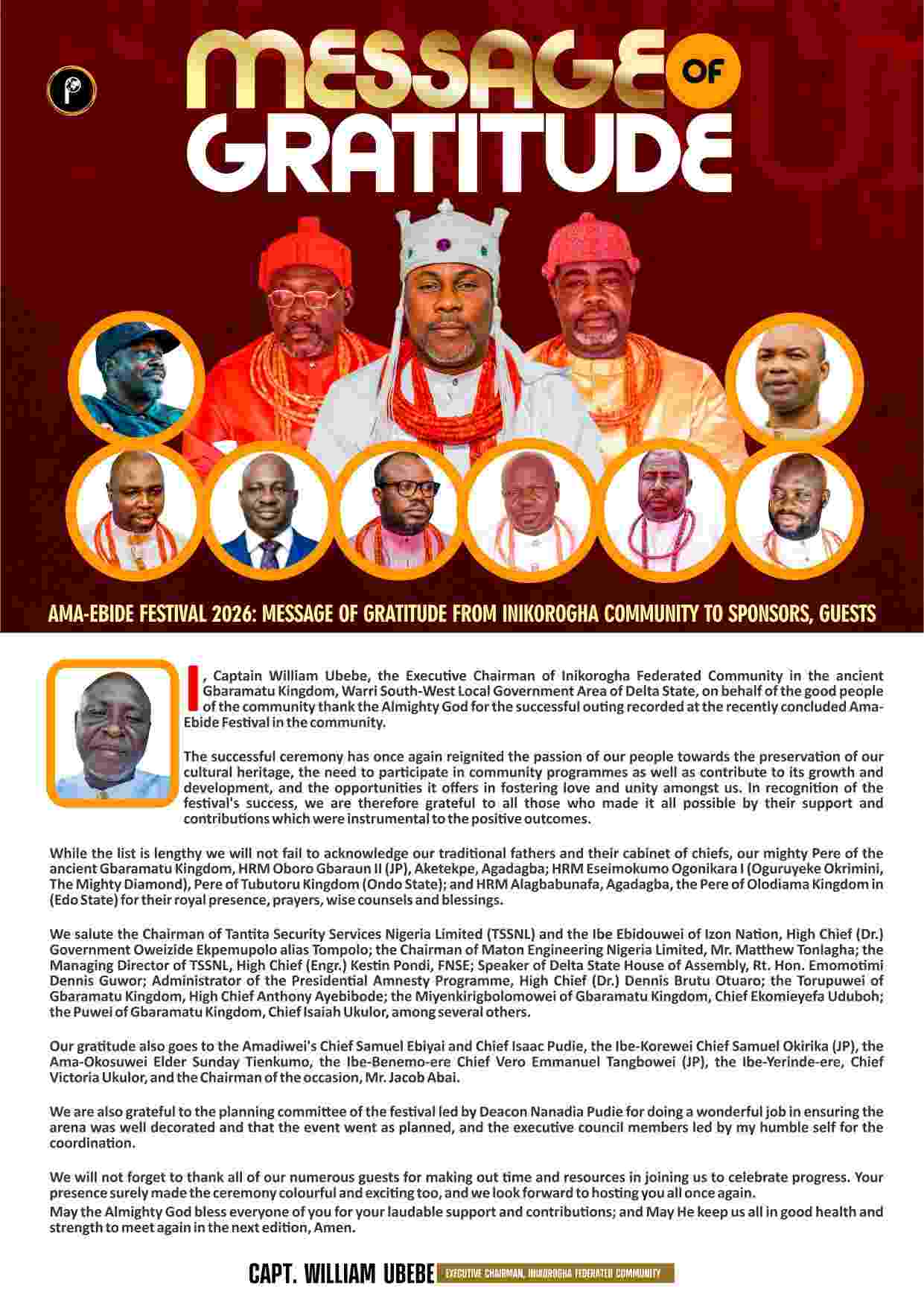 I, Captain William Ubebe, the Executive Chairman of Inikorogha Federated Community in the ancient Gbaramatu Kingdom, Warri South-West Local Government Area of Delta State, on behalf of the good people of the community thank the Almighty God for the successful outing recorded at the recently concluded Ama-Ebide Festival in the community.
