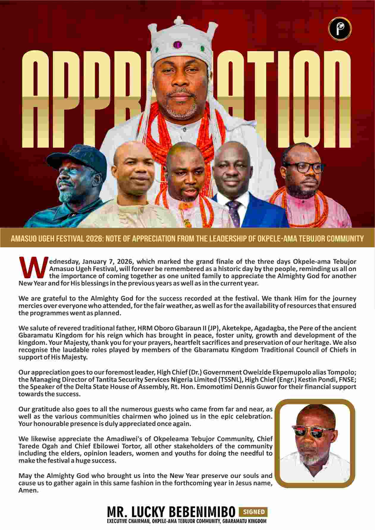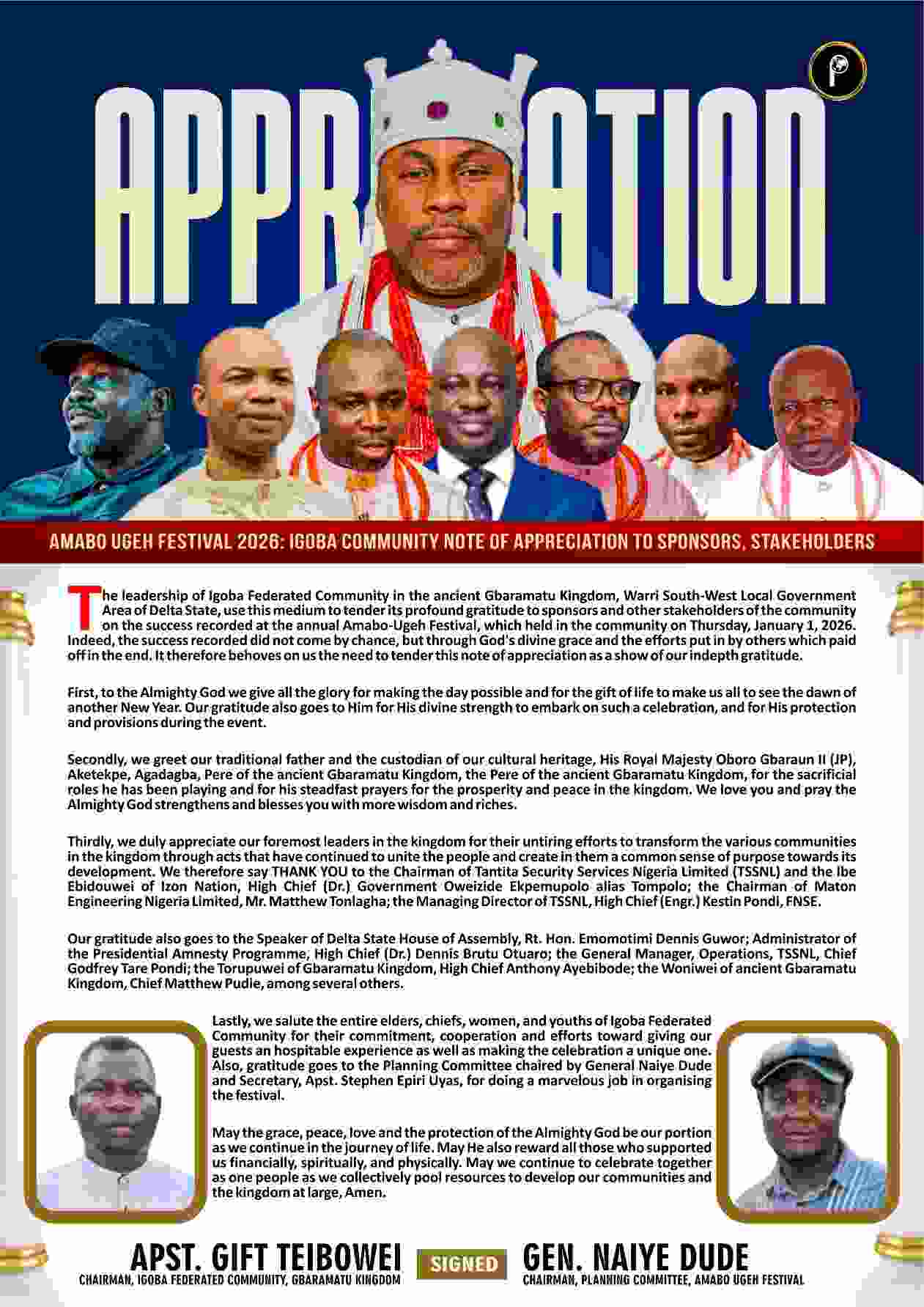 The leadership of Igoba Federated Community in the ancient Gbaramatu Kingdom, Warri South-West Local Government Area of Delta State, use this medium to tender its profound gratitude to sponsors and other stakeholders of the community on the success recorded at the annual Amabo-Ugeh Festival, which held in the community on Thursday, January 1, 2026.